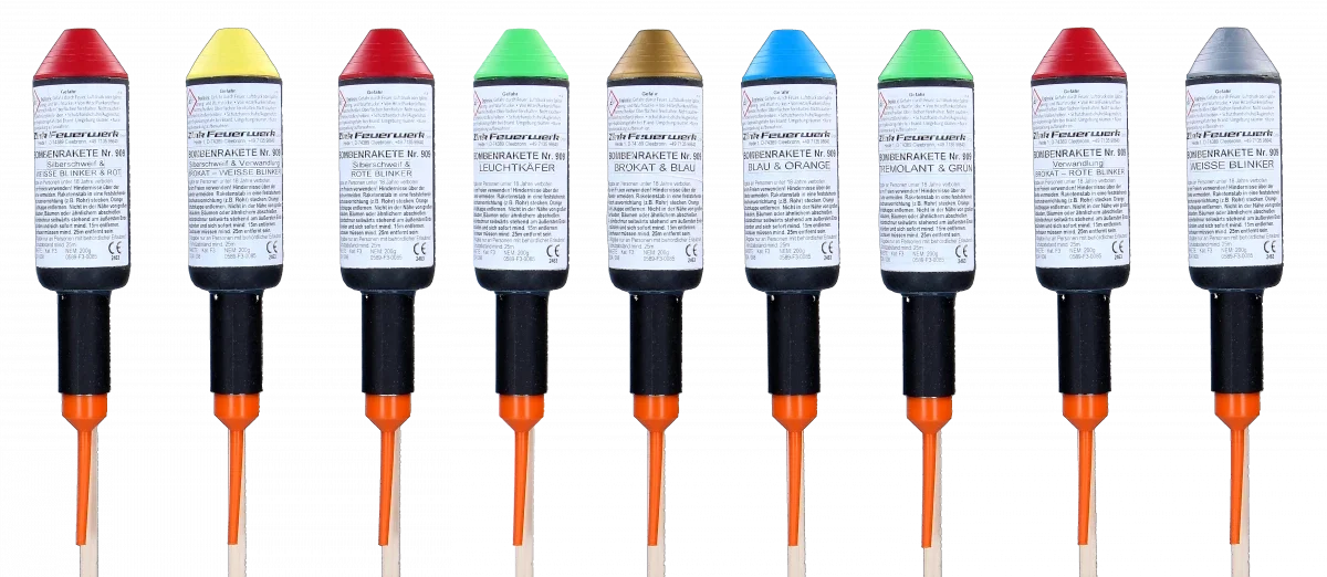 Die beliebten 200g-Raketen, das Maximum welches die Klasse F3 hergibt. Die 909 wird selbstverständlich komplett in feinster Handarbeit am Cleebronner Zink-Standort in Deutschland gefertigt, vom Leitstab, über Hülsen, Effektkörper, bis zur Spitzkappe. Die Steighöhe beträgt ca. 100m, der Mindestsicherheitsabstand 25m.